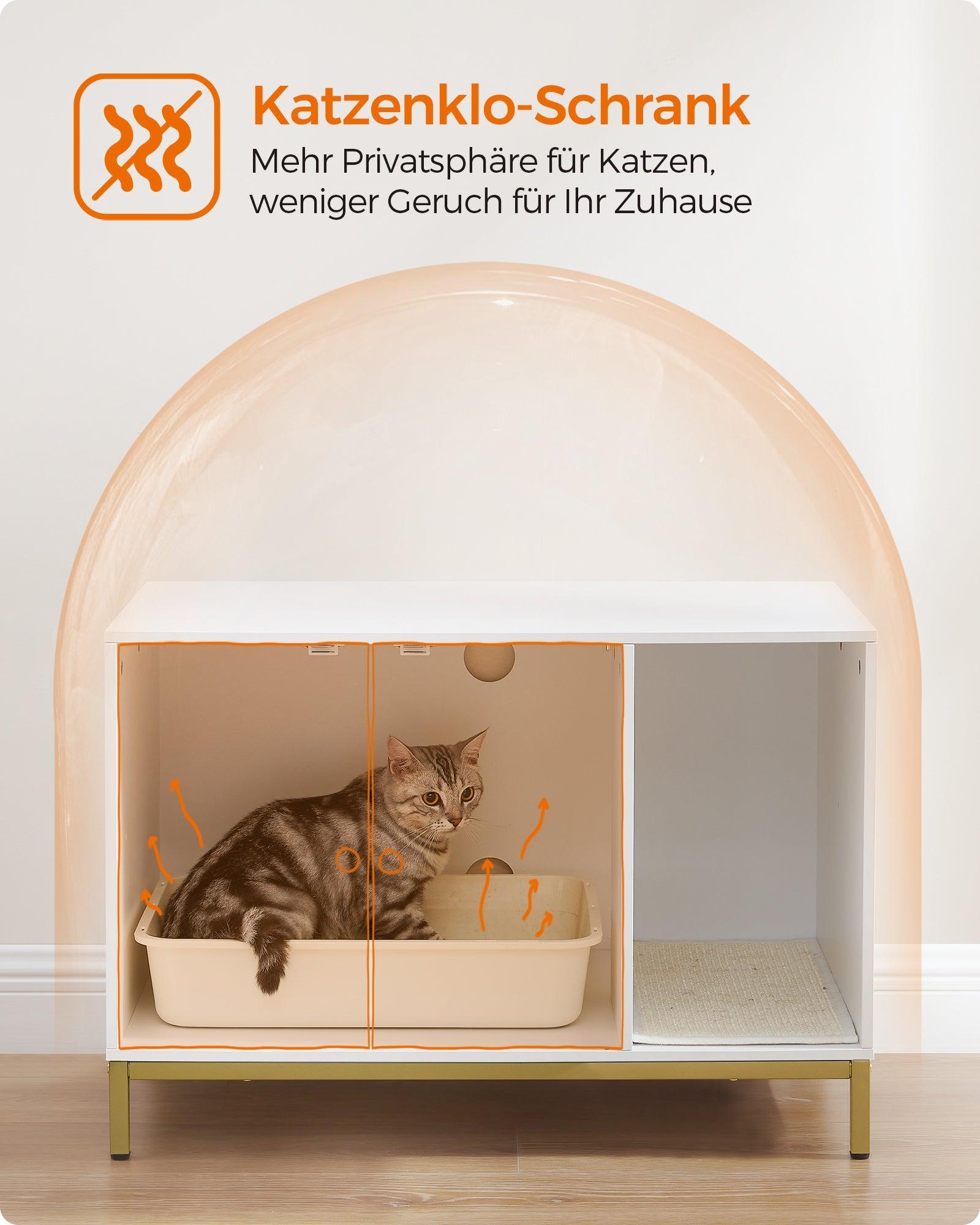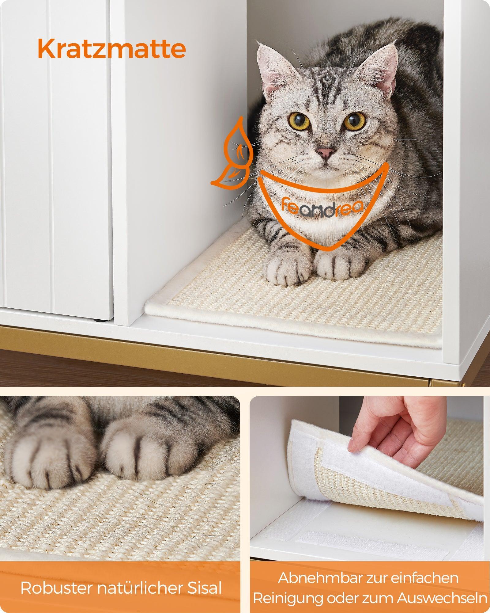 Feandrea namještaj za mačji pijesak, skriveni ormarić za posudu s pijeskom s prostirkom za grebanje, visokim nogicama, mačjom kućicom i dizajnom koji se može koristiti i kao pomoćni stolić, 80 × 50 × 55 cm, bijelo i zlatno