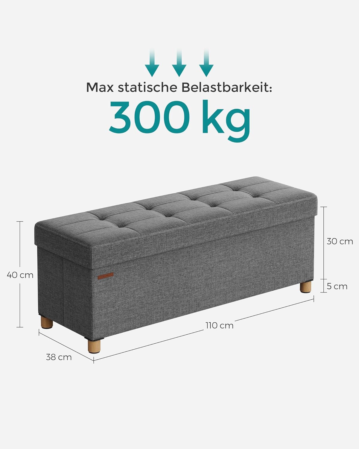 SONGMICS klupa s prostorom za pohranu, sklopiva klupa s nogama, tabure 38 x 110 x 40 cm, kutija za pohranu, maksimalna nosivost 300 kg, za dnevni boravak, spavaću sobu i hodnik, siva boja