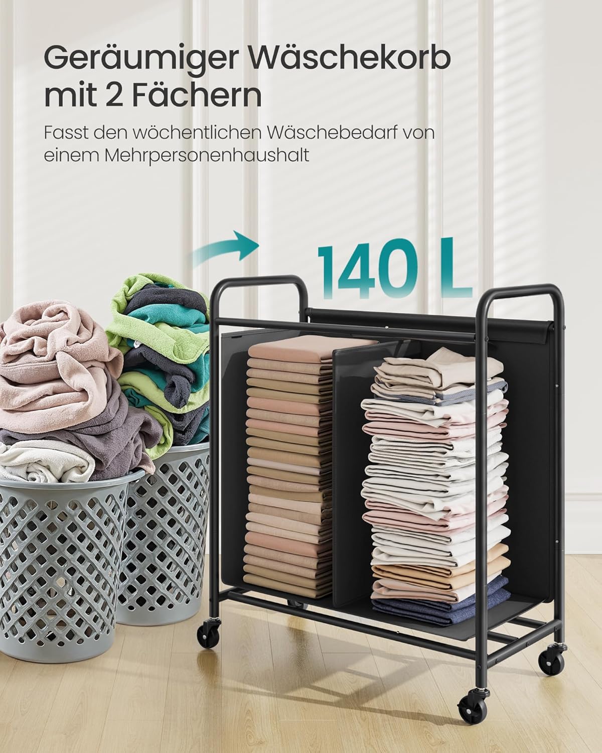 Košara za rublje na kotačima, 2 odjeljka, 140 L, crna