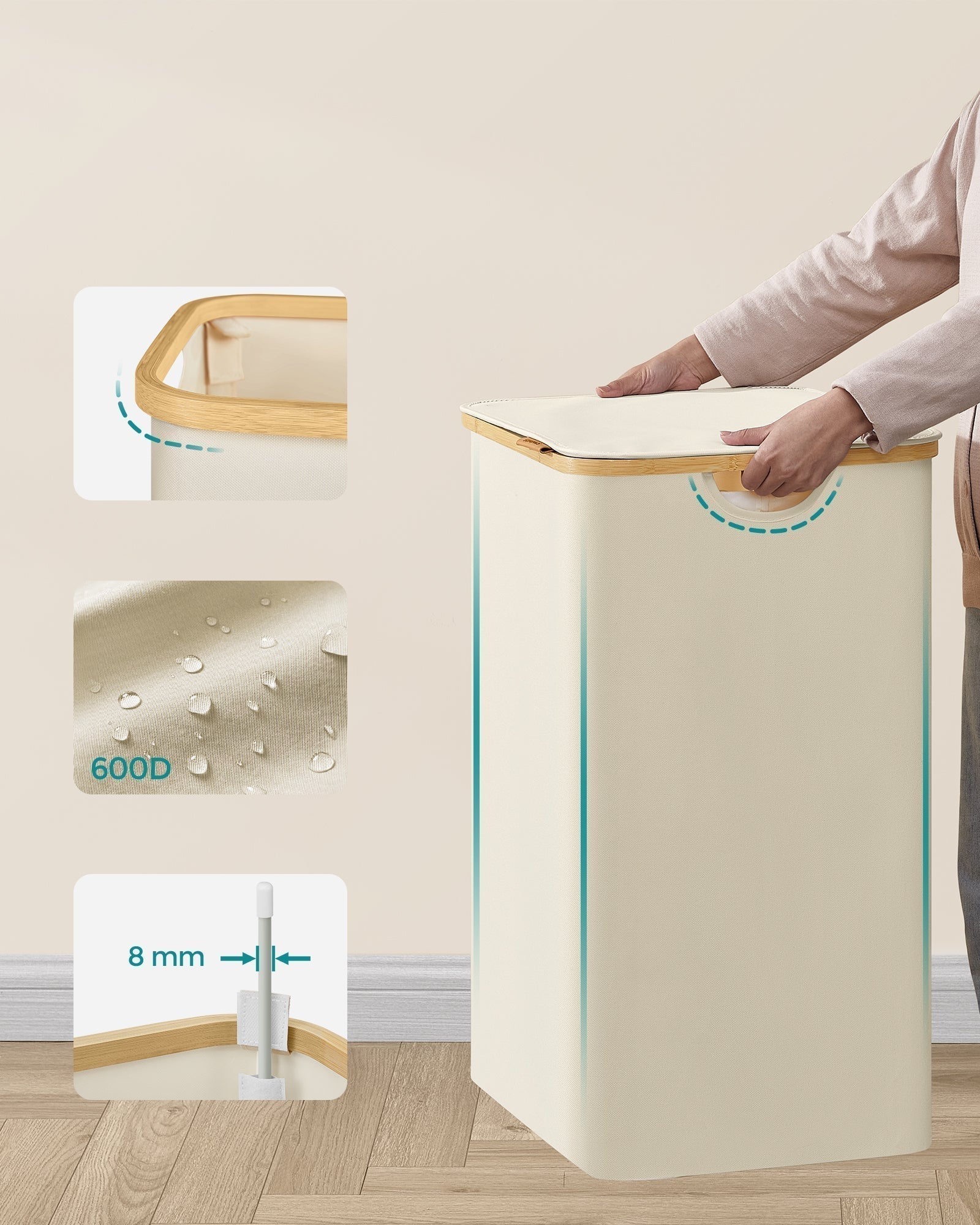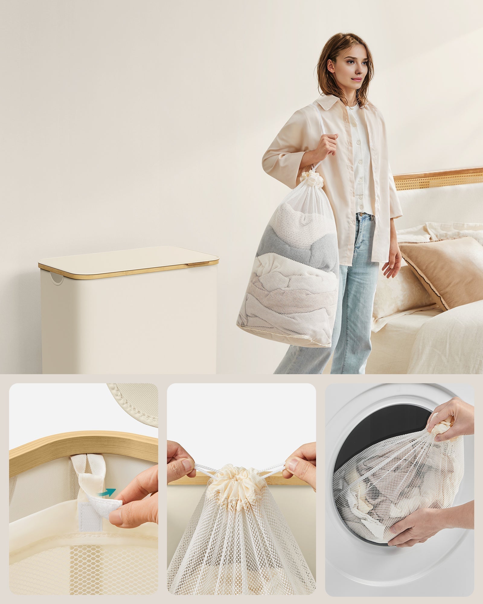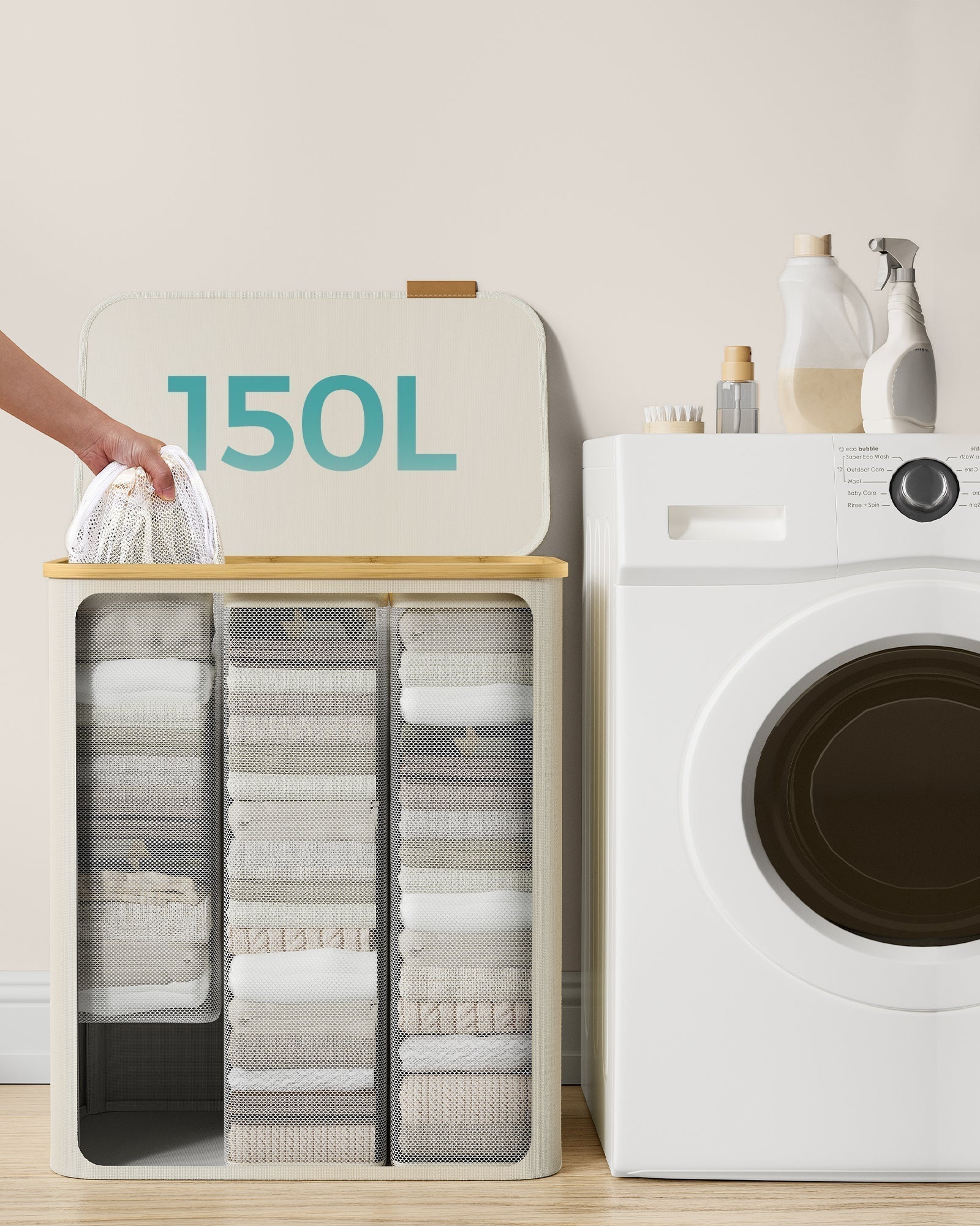 Košara za rublje od Oxford tkanine, 150 L, odvojiva mrežasta vreća, ručka od bambusa, krem-bijela