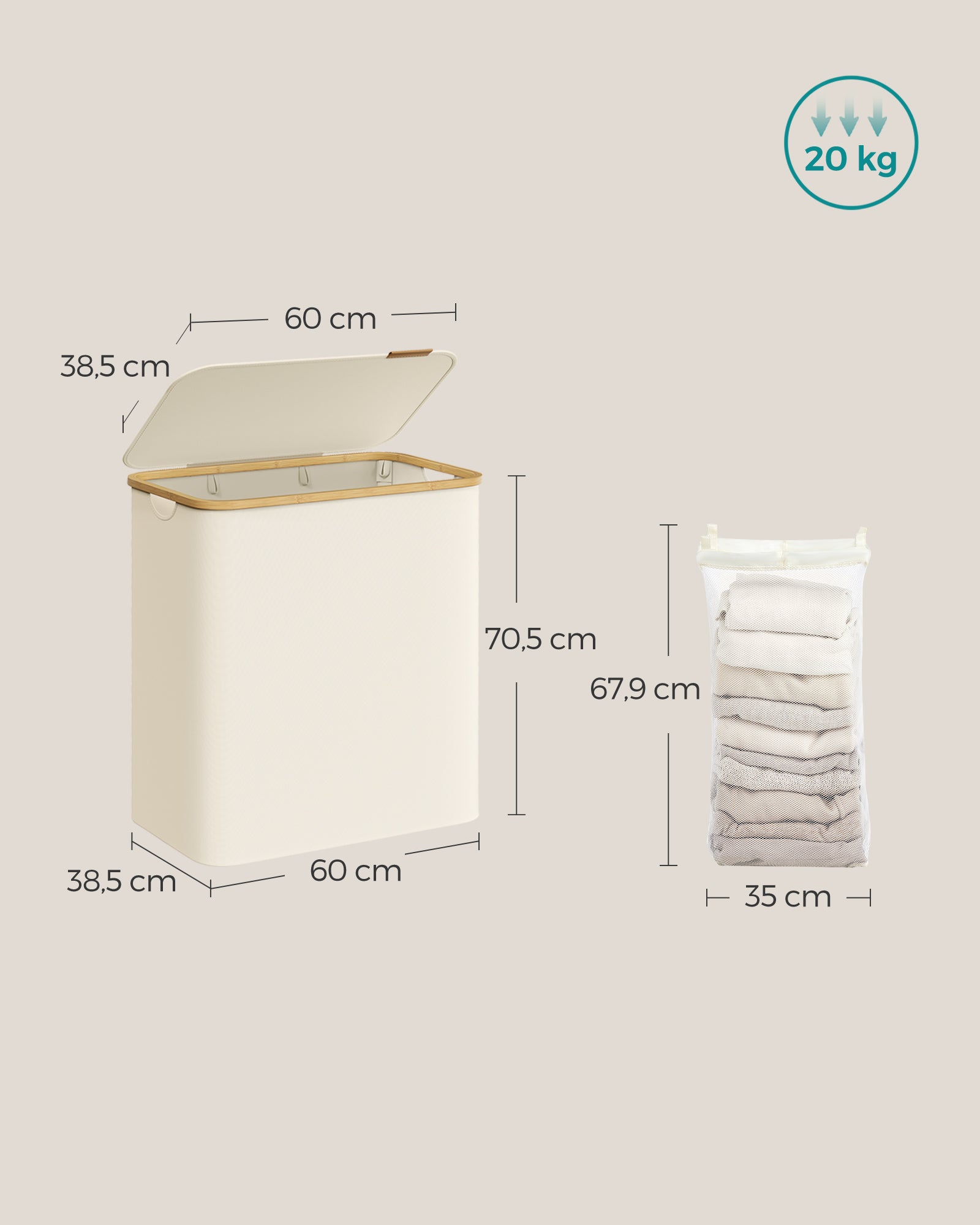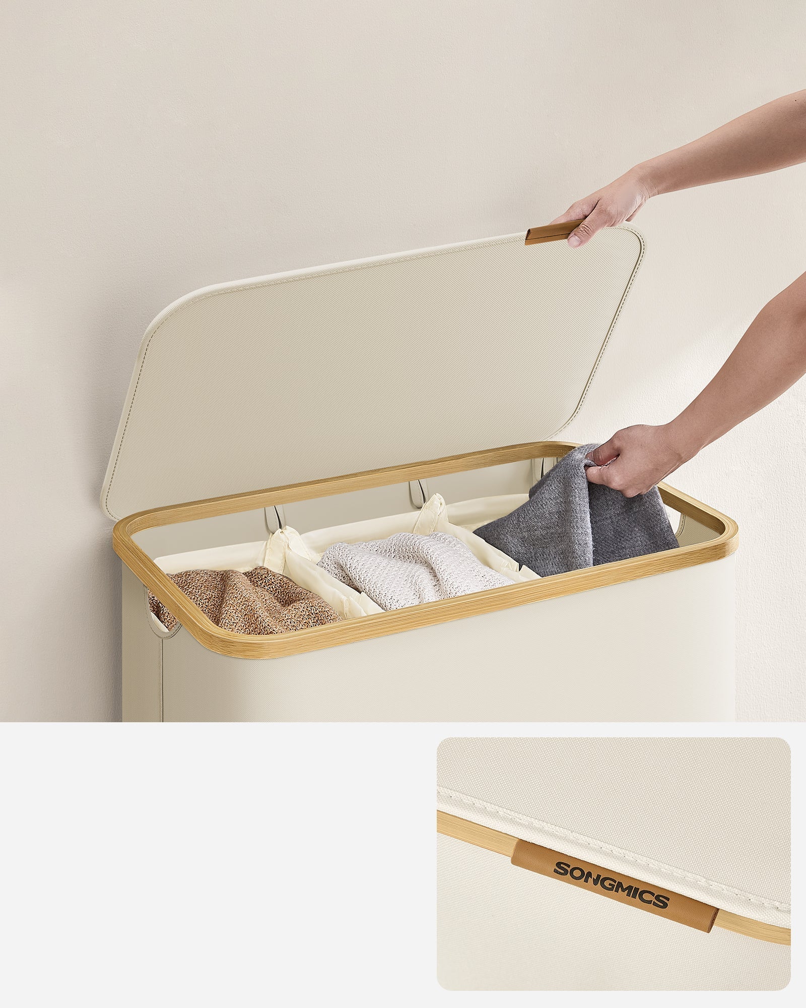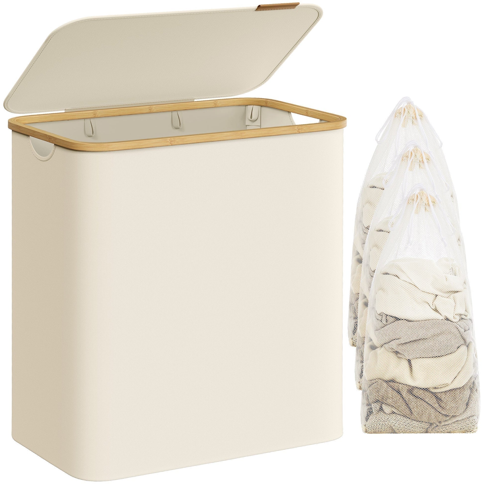 SONGMICS Košara za rublje Oxford tkanina, 150L, izvadivi mrežasti vrećica, bambus ručka krem bijela