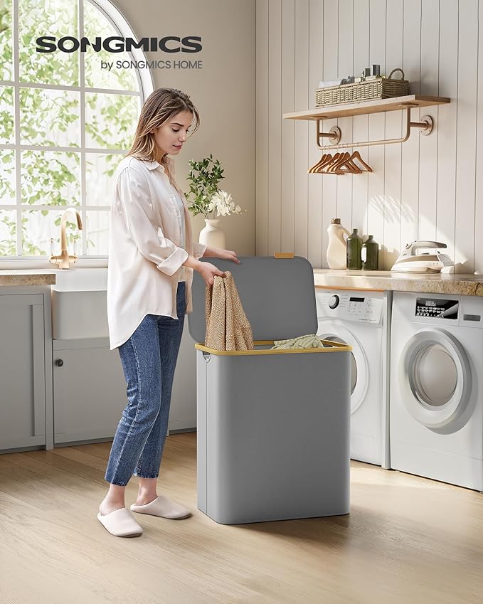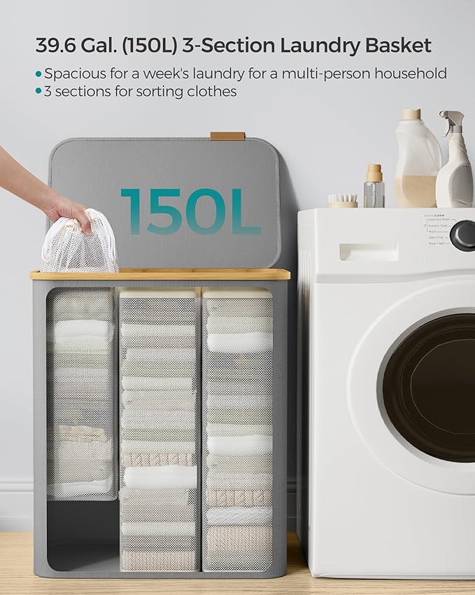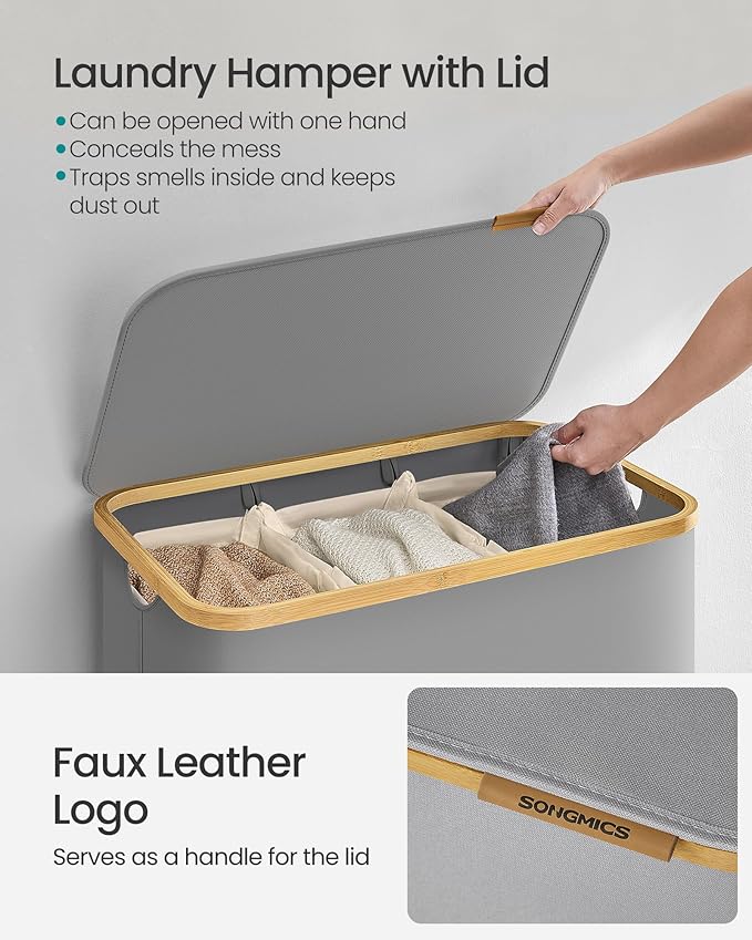 SONGMICS koš za rublje s poklopcem, 3 pregrade, 150 L, uklonjiva vreća, Oxford tkanina, bambus ručke, sklopiv, 60 x 38,5 x 70,5 cm, siva golubica