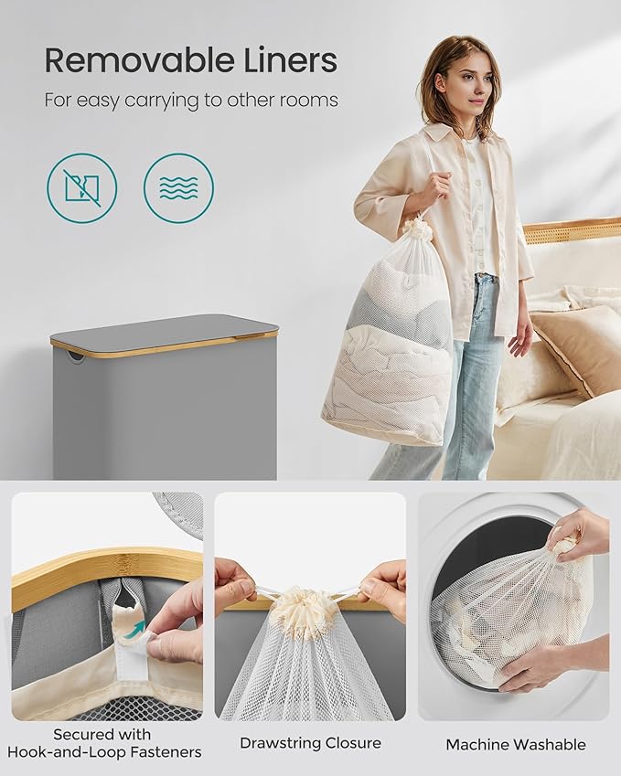 SONGMICS koš za rublje s poklopcem, 3 pregrade, 150 L, uklonjiva vreća, Oxford tkanina, bambus ručke, sklopiv, 60 x 38,5 x 70,5 cm, siva golubica [Ušteda prostora] Ovaj uski koš za rublje od 150 lit… Pročitaj više