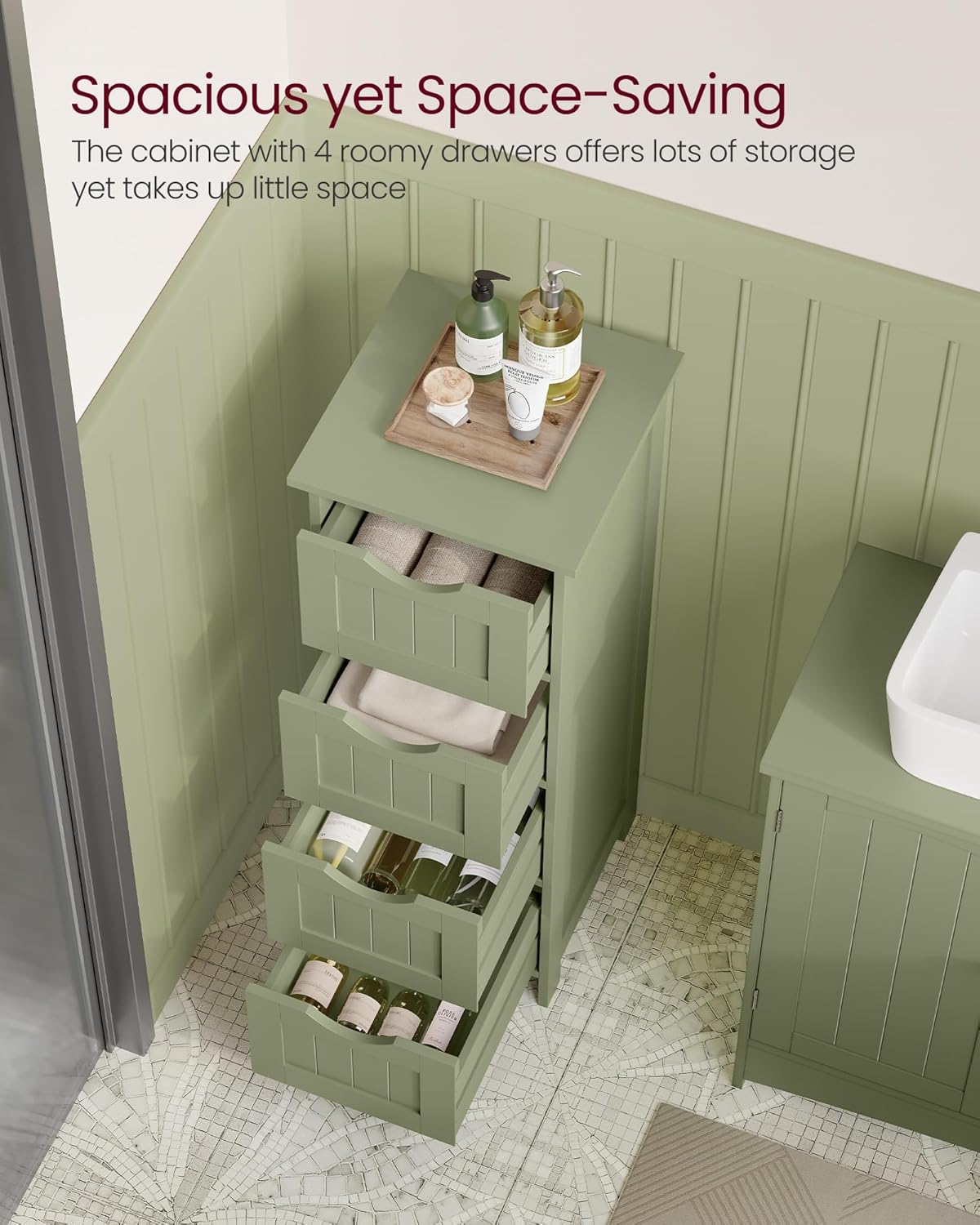 VASAGLE kupaonski samostojeći ormarić za pohranu, kupaonska jedinica s 4 ladice, samostojeći kupaonski ormarić, 30 x 30 x 82 cm, za dnevni boravak, blagovaonicu, kuhinju, moderni stil, lovorzelena