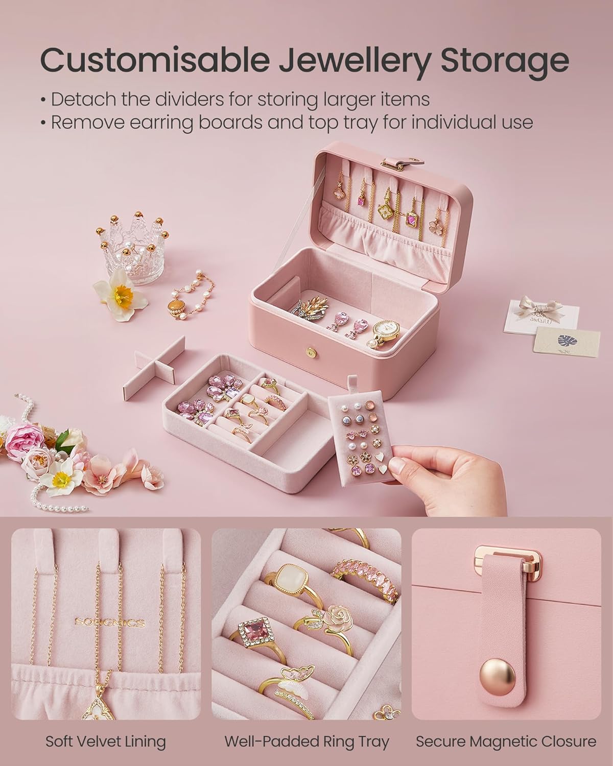 SONGMICS Kutija za nakit, 2-slojni organizator za nakit, 11 x 16 x 8 cm Putna kutija za nakit, Prijenosni organizator za nakit, Mala, Prostrana, za veće dodatke, Ideja za poklon, ružičasta