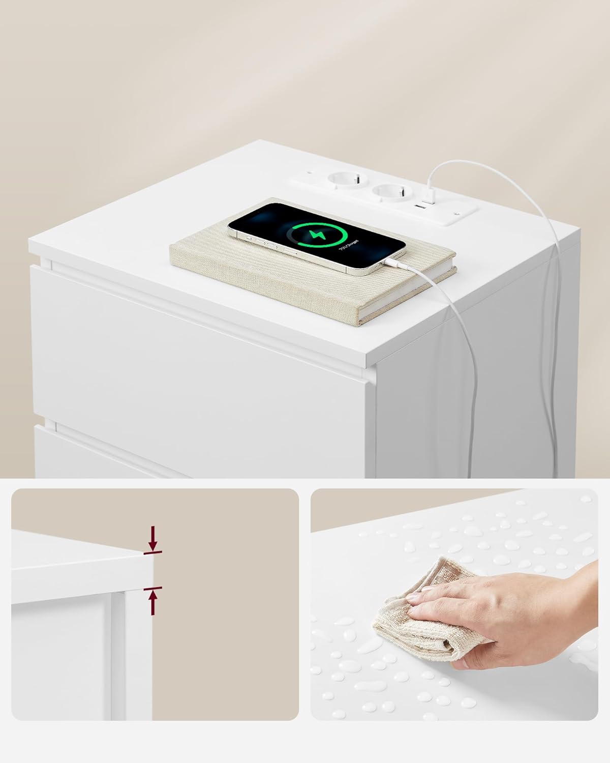 VASAGLE noćni ormarić, bočni stol, s 3 ladice, zaobljenim rubovima, s 2 mrežna utikača i 2 USB priključka, za dnevni boravak, spavaću sobu ili ured, modernog stila, u boji oblaka Udobna punionica … Pročitaj više