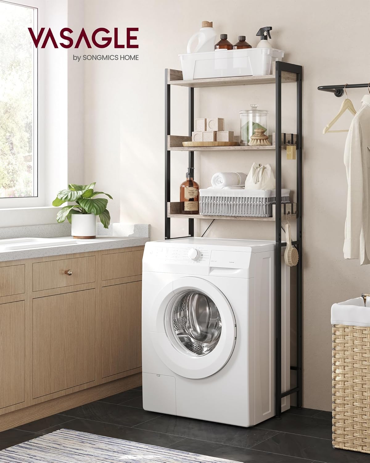 VASAGLE 3-slojni WC-polica za postavljanje iznad, štedljiva kupaonska polica, lako se sastavlja, pogodna i za postavljanje iznad perilice, industrijskog stila, u sivo-bež i crnoj boji