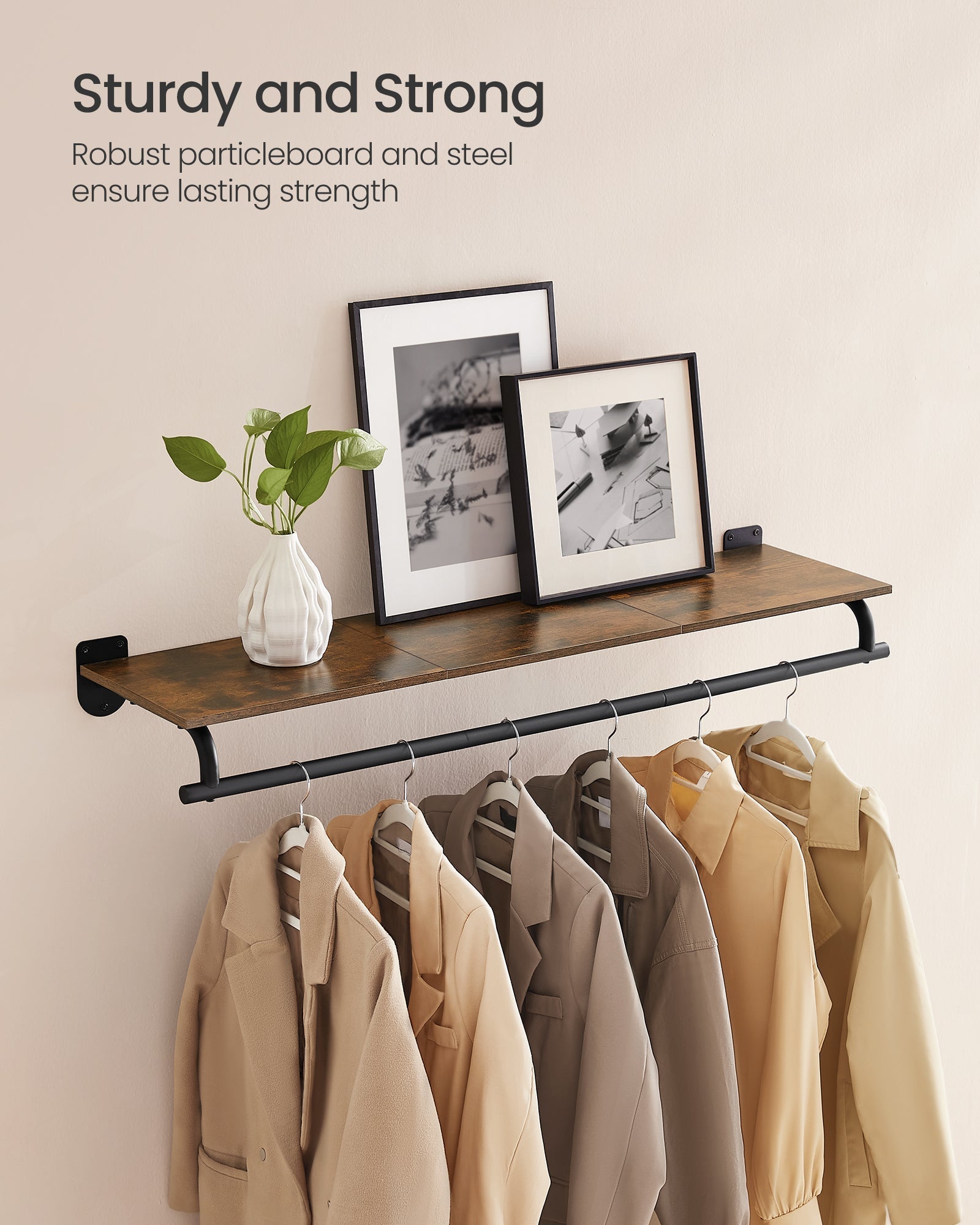 SONGMICS Fiksni Stalak za Odjeću, Zidna Polica s Okačalom, Do 60 kg Nosivosti, 28 x 109 x 13,2 cm, Predsoblje, Spavaća Soba, Garderoba, Rustikalno Smeđa i Crna