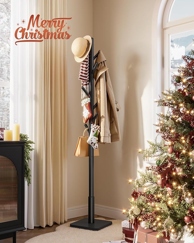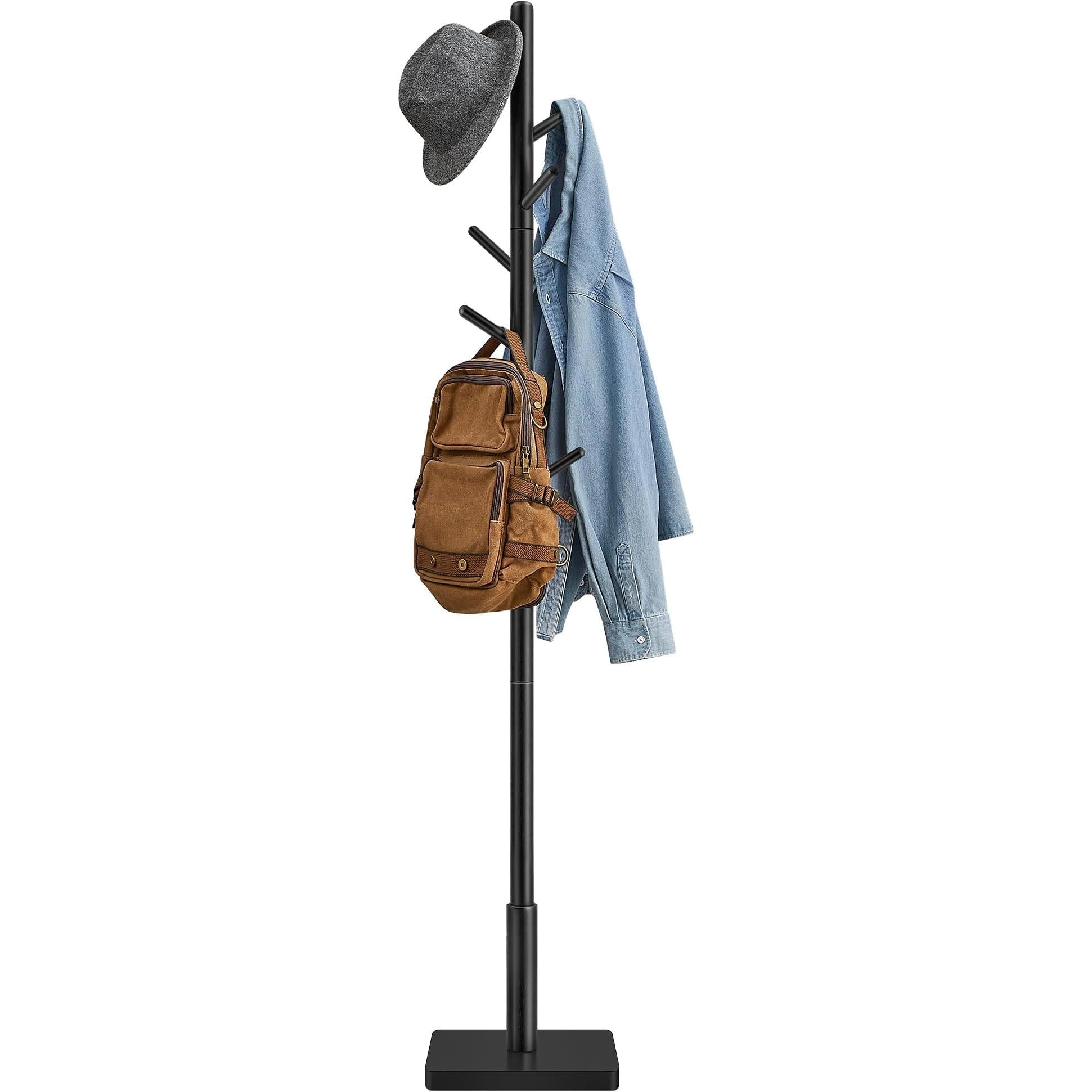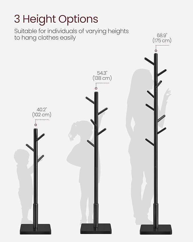 VASAGLE stalak za odjeću od masivnog drva, samostojeća vješalica za hodnik s 8 kuka, 3 podesive visine, za kapute, šešire, torbe i dodatke, za hodnik ili predvorje, s kukama i šipkom od gumenog drva, crne boje