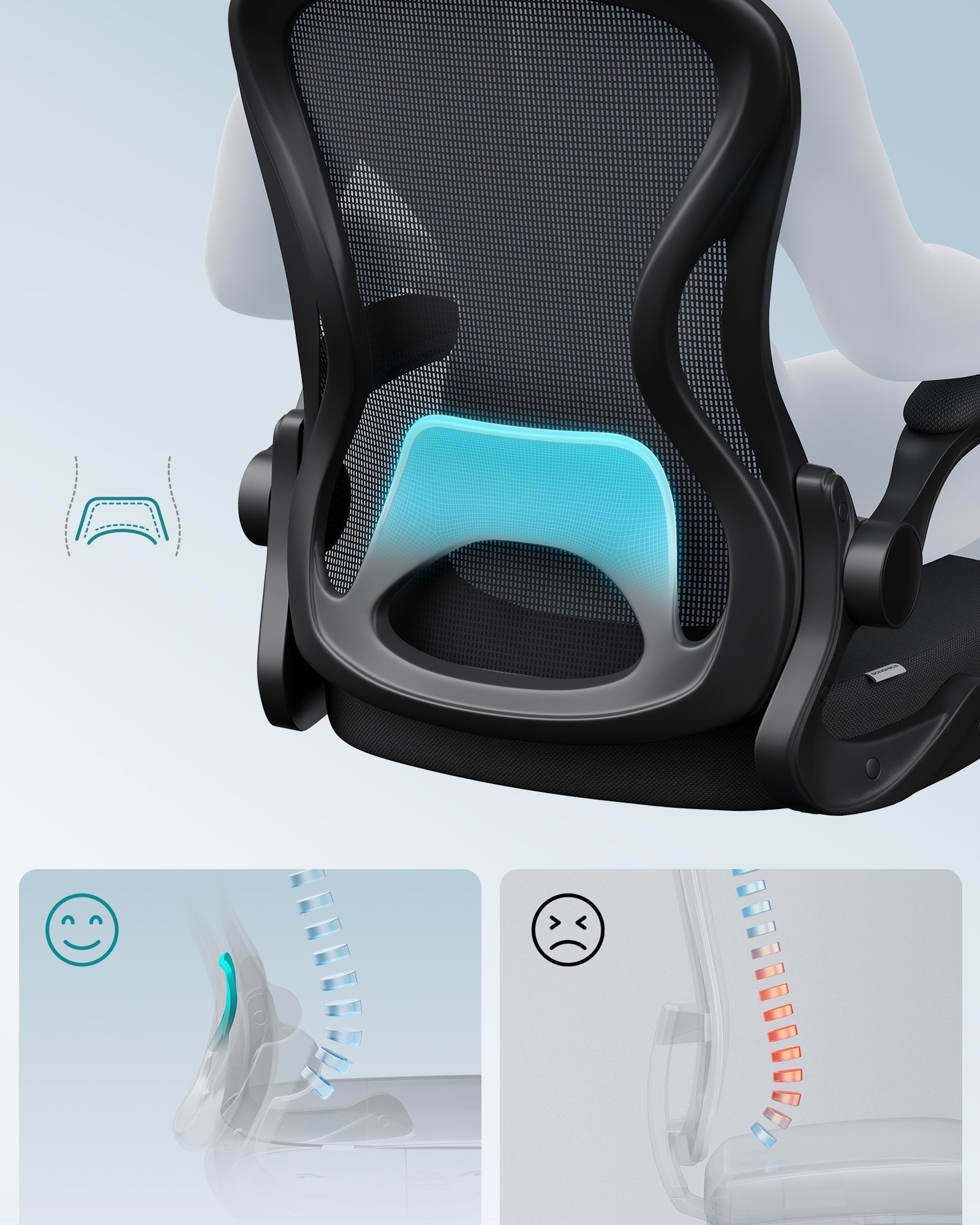 SONGMICS ergonomska uredska stolica, okretna mrežasta stolica za radni stol, s lumbalnom potporom, funkcijom nagiba i preklopnim naslonima za ruke, za učenje i spavaću sobu, tinta crna