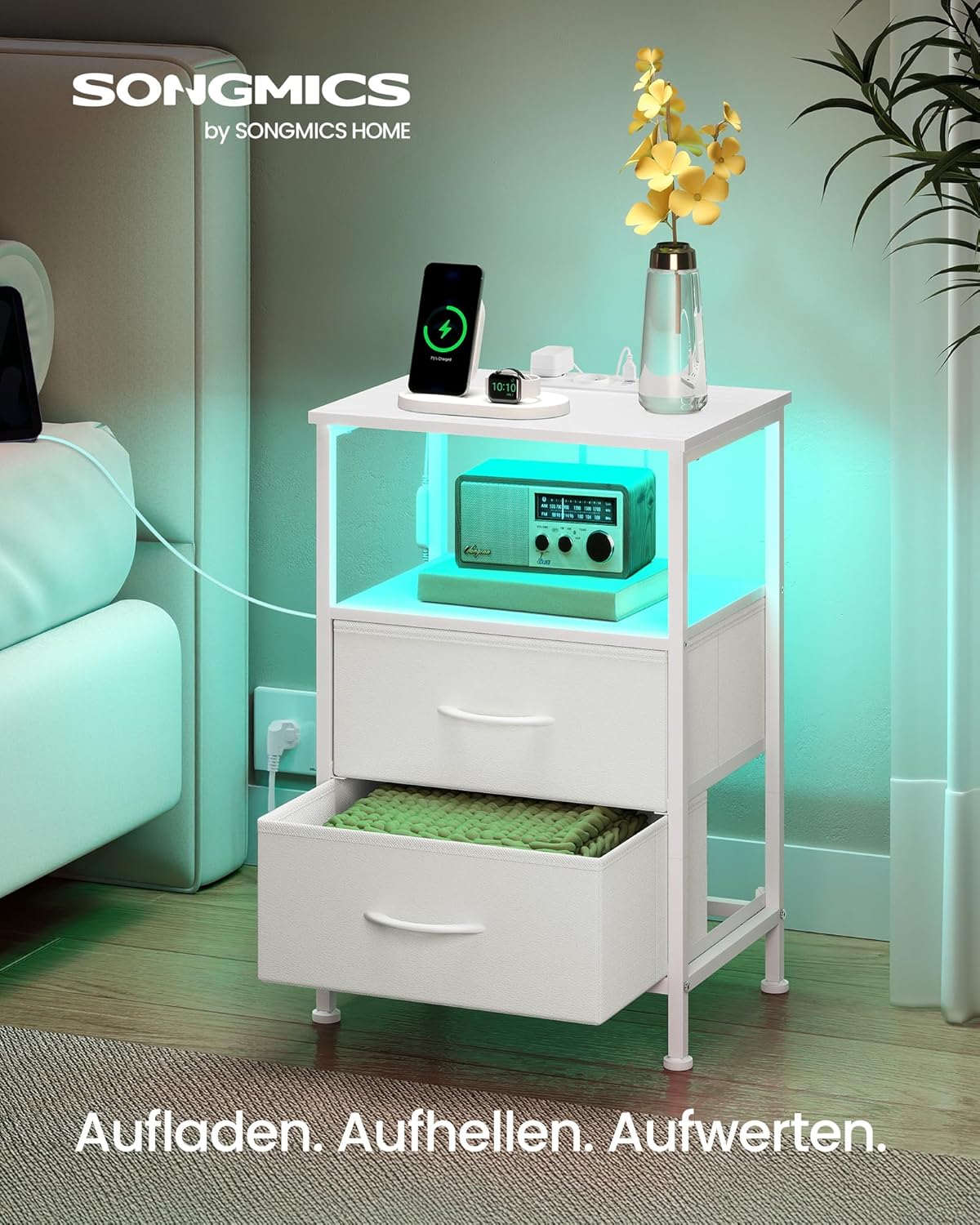SONGMICS BELLAH kolekcija noćni ormarić s punjačem, upravljiv putem aplikacije, s podesivim LED osvjetljenjem, 1 otvorenom policom, 2 ladice, oblačno bijela/snijeg bijela