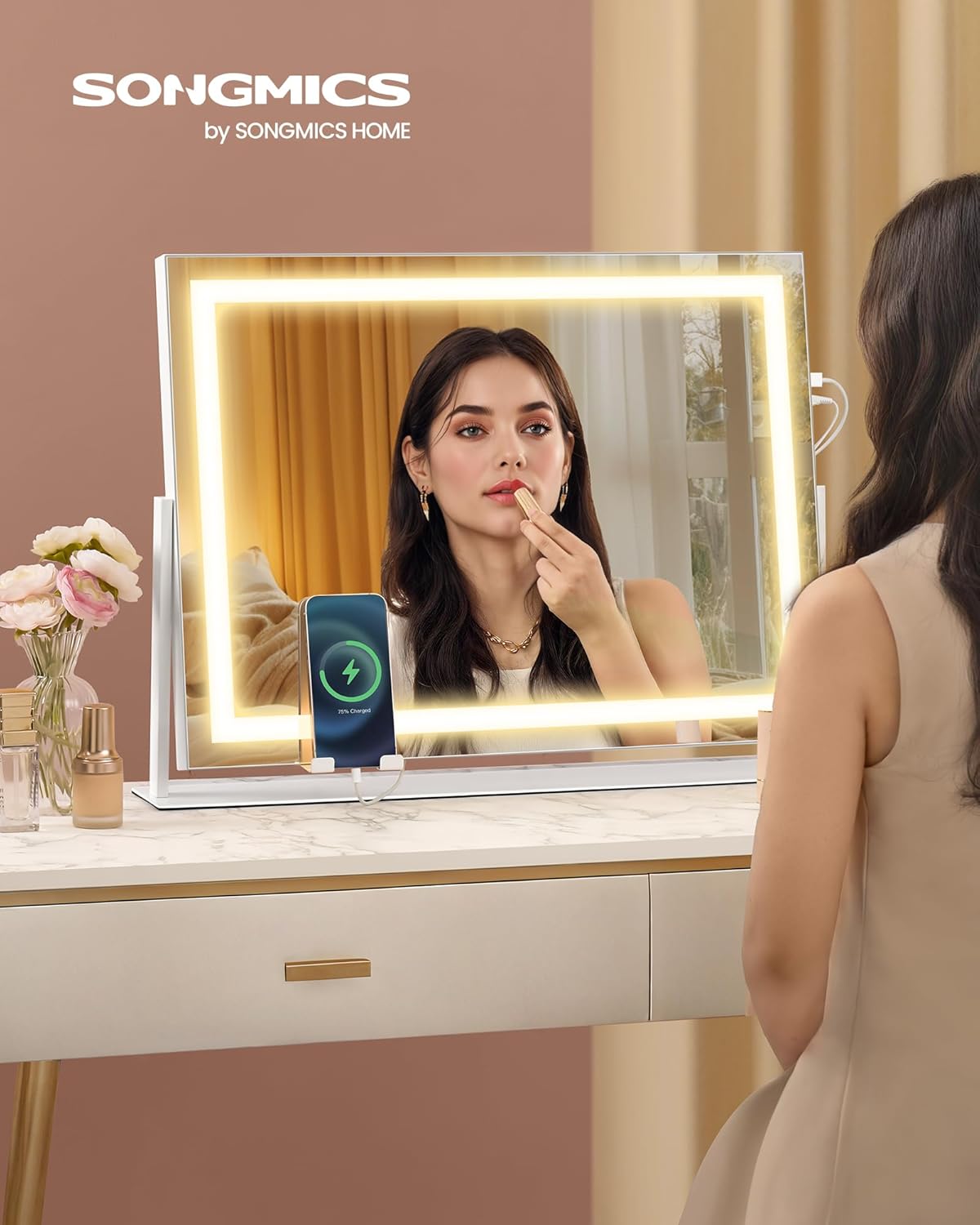 SONGMICS kozmetičko ogledalo s rasvjetom, 58 x 43 cm, ogledalo za šminkanje LED rasvjetom, s priključcima za punjenje, upravljanjem na dodir, 3 boje svjetla, s podešavanjem jačine svjetla, držačem za mobitel, mat bijelo