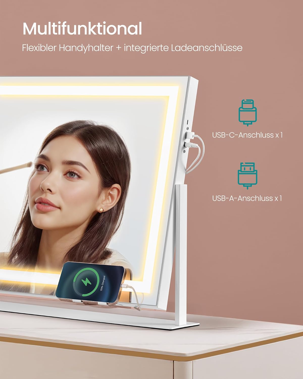 - Pažljivo osmišljeni detalji: Držač za mobitel, koji se može montirati s obje strane, odgovara većini mobitela i tableta te omogućuje gledanje videa tijekom šminkanja. USB-A i USB-C priključci omogućuju punjenje uređaja dok se šminkate