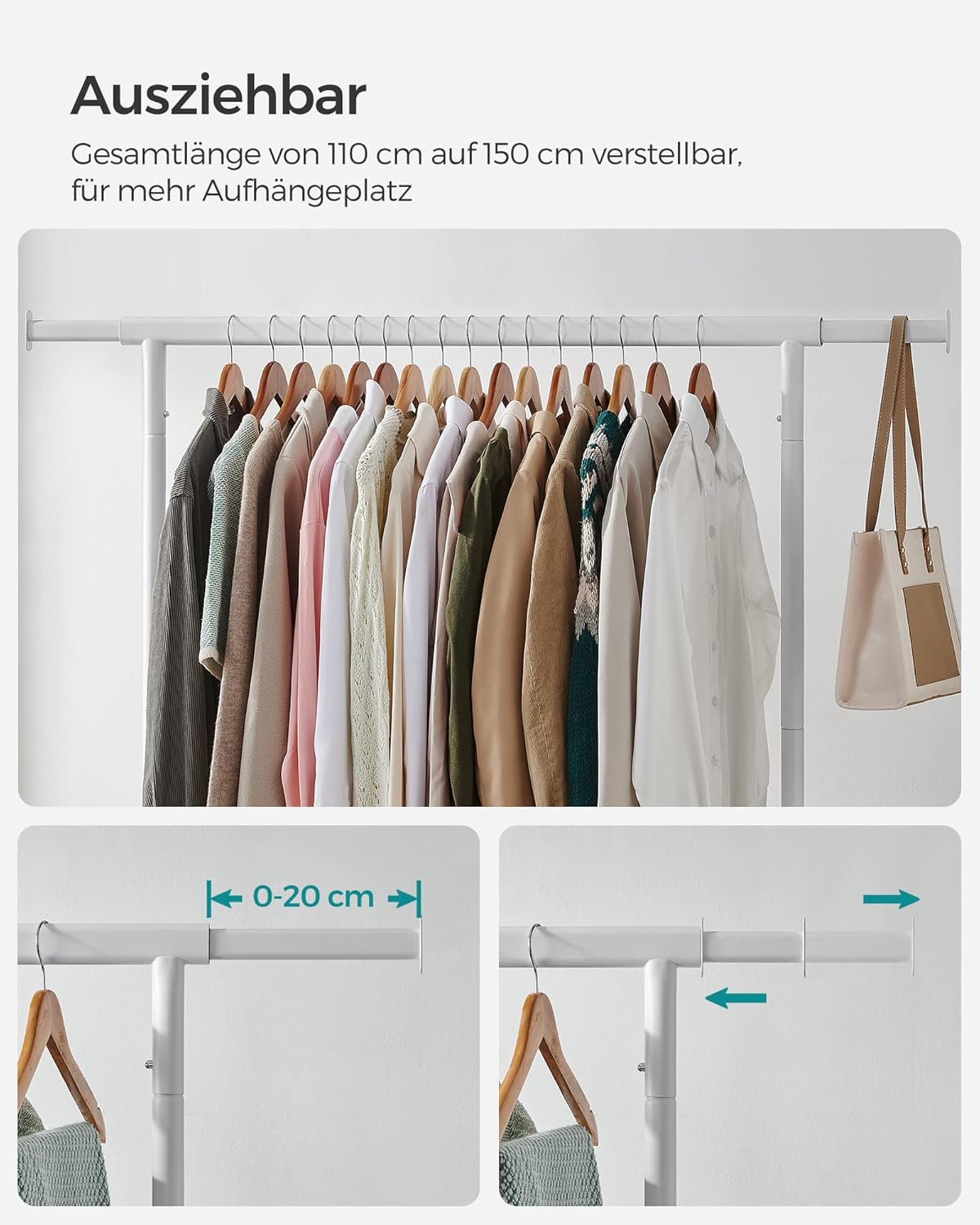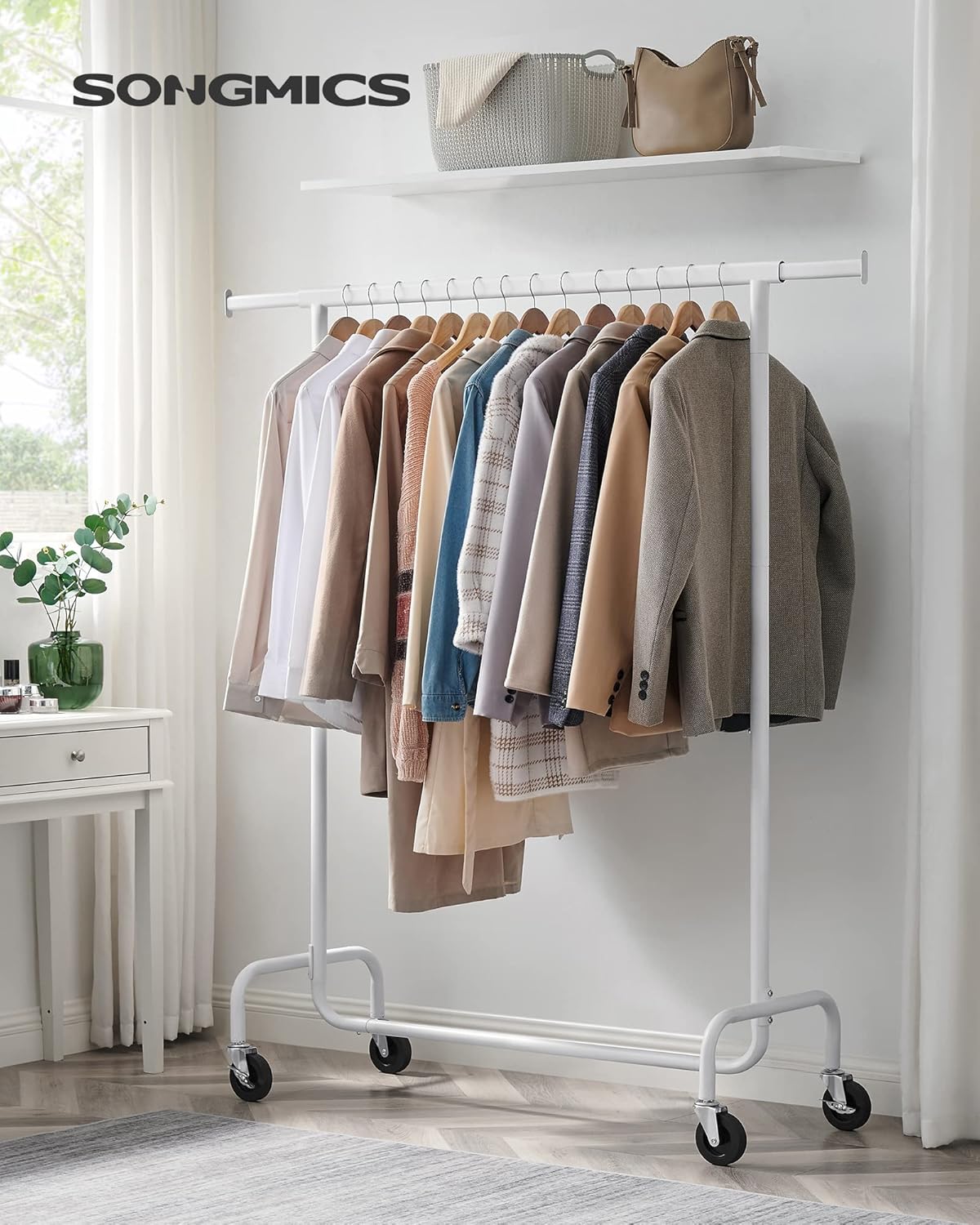 SONGMICS stalak za odjeću na kotačima, šipka na izvlačenje, max. 130 kg nosivost, mat bijela