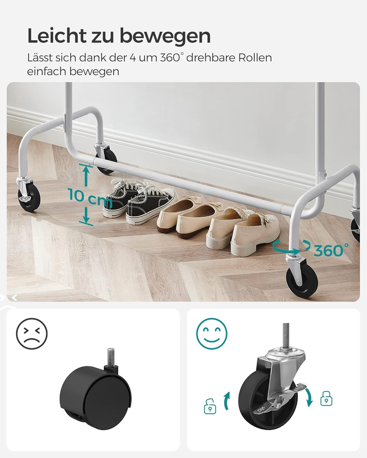 - [Lako prenosiv i fiksabilan] Zahvaljujući 4 kotača koji se okreću 360° (od kojih su 2 fiksabilna), stalak za odjeću lako se premješta iz spavaće sobe u garderobu i može se fiksirati na jednom mjestu po potrebi