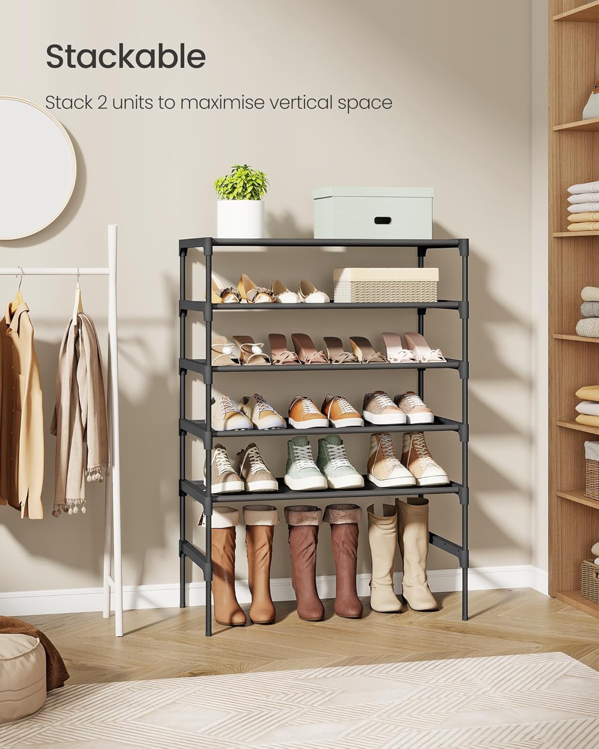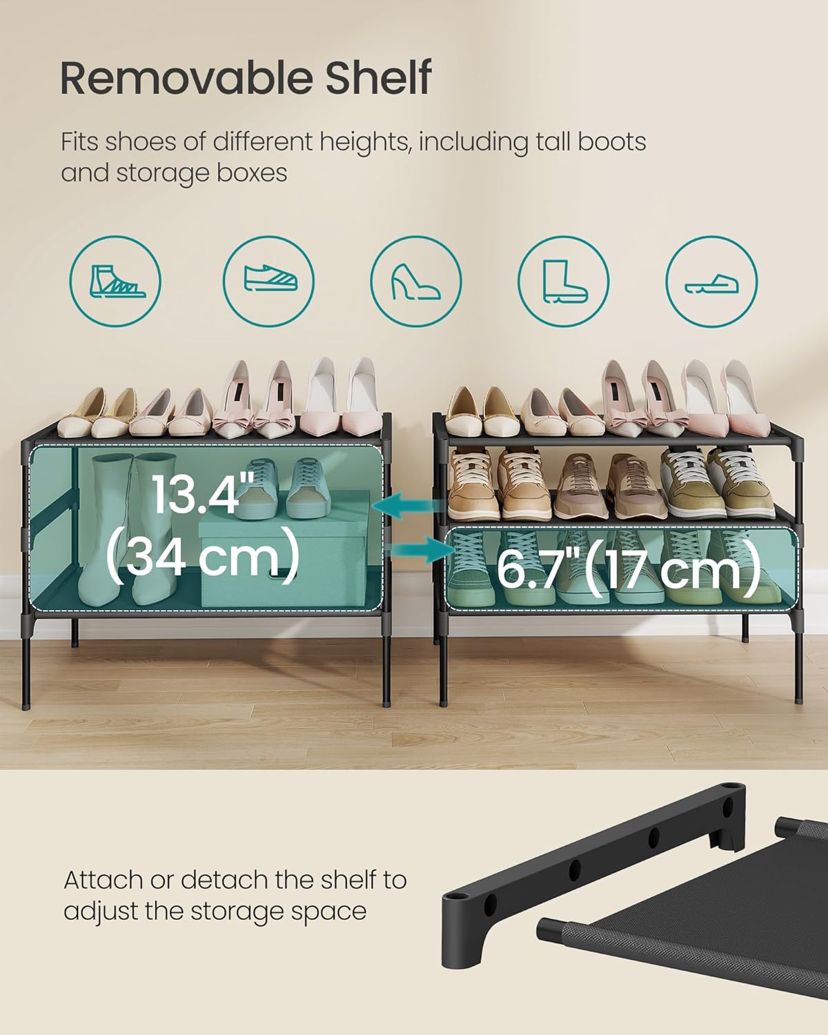 - Složivo i prilagodljivo: Postavljanjem 2 jedinice jednu na drugu možete maksimalno iskoristiti vertikalni prostor ili ukloniti jednu policu kako biste dobili više mjesta za čizme—lako se prilagođava vašim potrebama