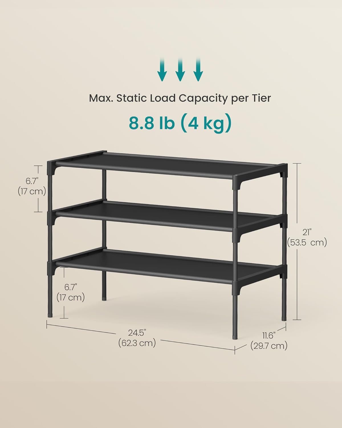 SONGMICS stalak za cipele s 3 razine, organizator za pohranu obuće, za predsoblje, ušteda prostora, 29,7 x 62,3 x 53,5 cm, metalni okvir, police od netkanog tekstila, tintno crna Veliki kapacitet: O… Pročitaj više