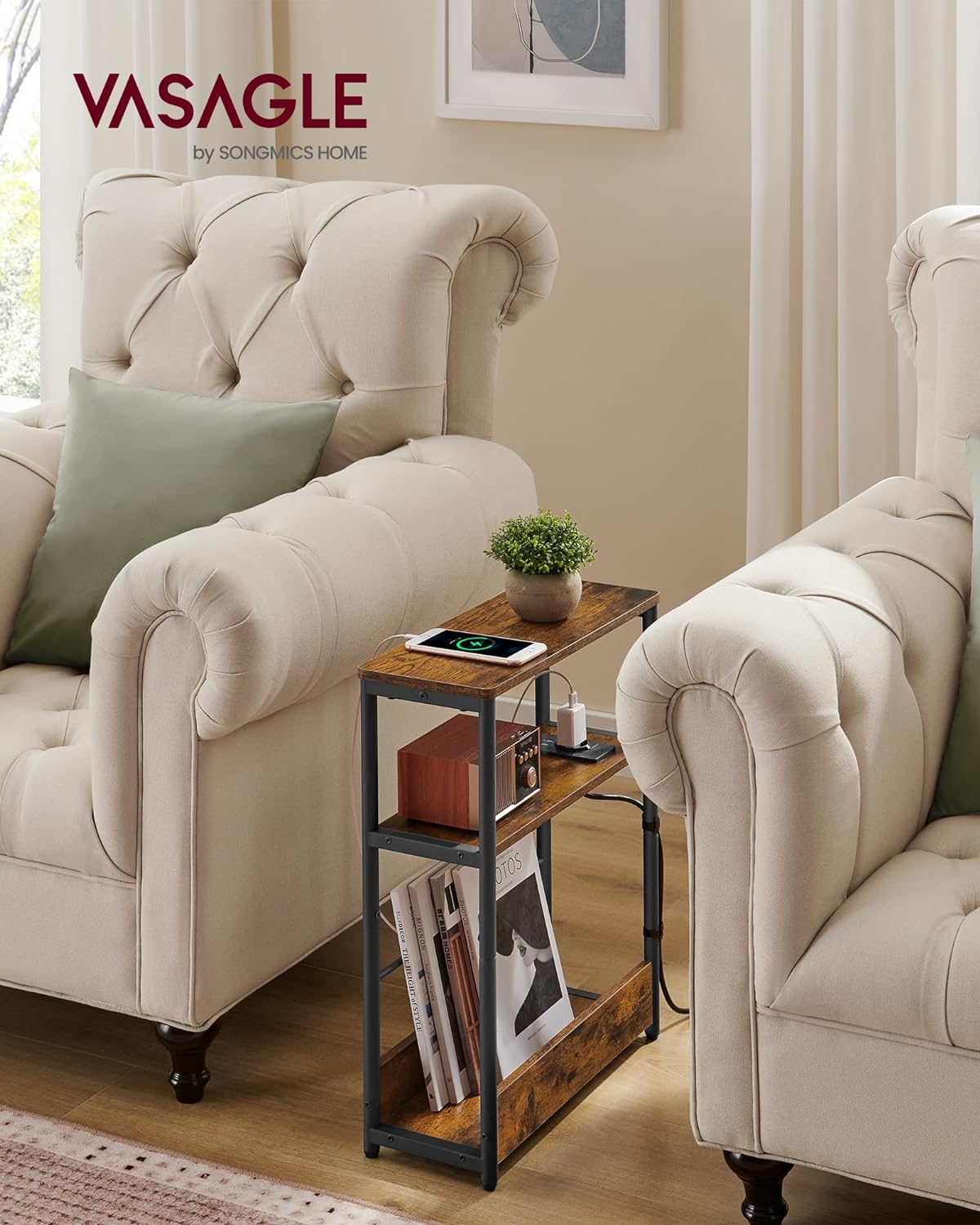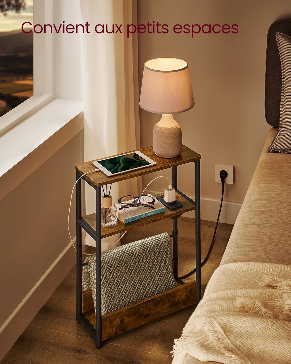 Uski bočni stol s funkcijom punjenja, stolić, mali, 3 police, držač časopisa, za dnevni boravak, spavaću sobu, radnu sobu, rustikalno smeđa