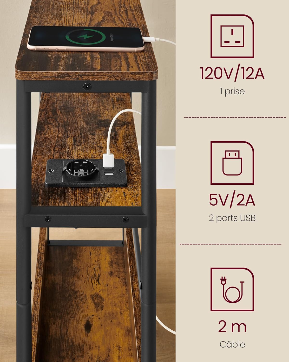 Uski bočni stolić s funkcijom punjenja, 3 police, 18 x 45 x 58 cm, rustikalno smeđa