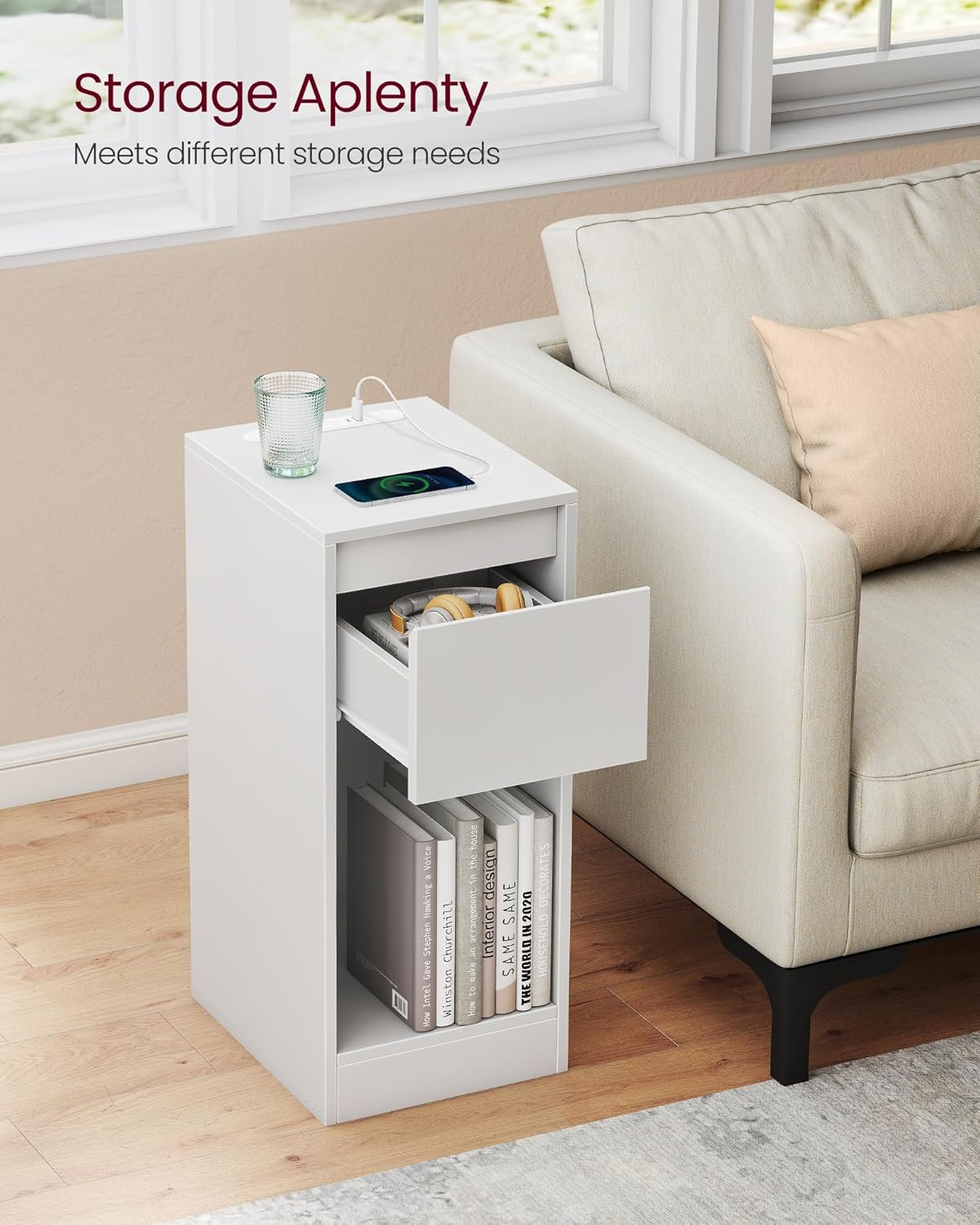 VASAGLE uski noćni ormarić s punjačkom stanicom i LED svjetlom, elegantna bočna stolić, s USB portovima, ladicom i otvorenom policom, za spavaću sobu, dnevni boravak, bijela